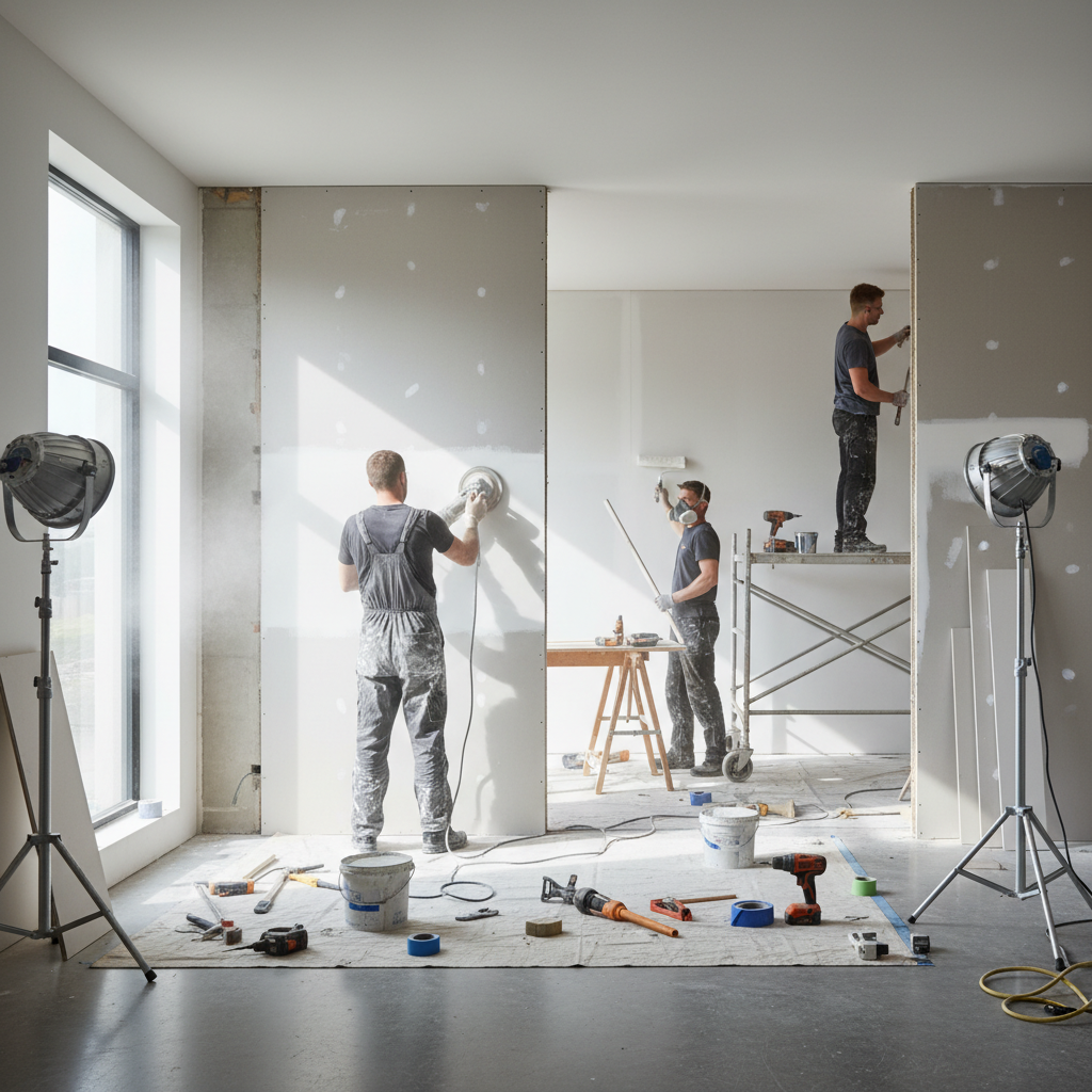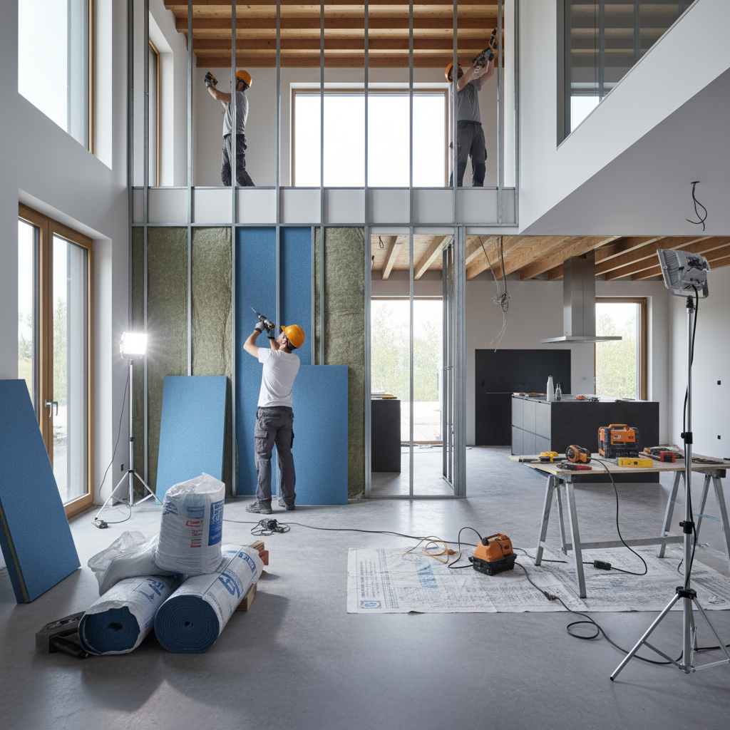 Pose des ossatures, montage des cloisons et intégration des équipements techniques. Respect scrupuleux des normes de sécurité et de qualité.